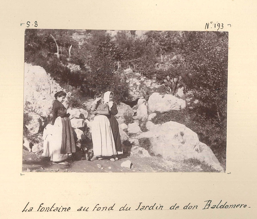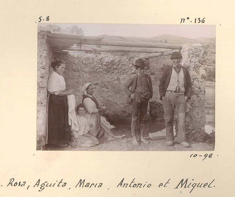 La ambición documental se traduce en una variedad de encuadres y temas que desbordan cualquier interés puramente geológico. Hay vistas generales que capturan la topografía con precisión cartográfica, pero también retratos espontáneos, escenas de trabajo, arquitectura popular y detalles domésticos que solo alguien instalado en el lugar habría podido registrar. Incluso los títulos manuscritos revelan una complicidad creciente con el entorno: «Porteurs de jambons», lejos de referirse a cargadores humanos, designa con humor galo a una piara de cerdos que atraviesa la Higuerilla, un guiño que delata la mirada irónica y afectuosa del autor.