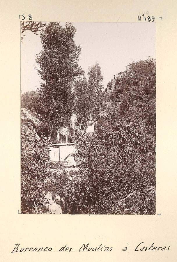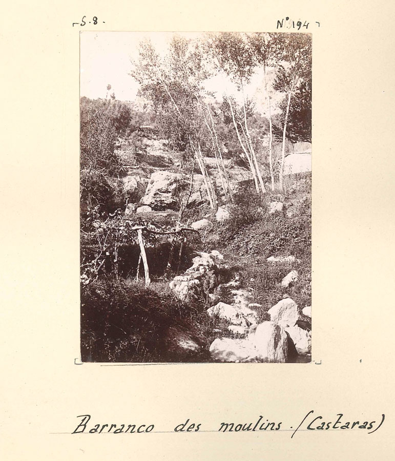 El agua constituye otro de los ejes silenciosos del álbum. Busquet dedica varias placas a los barrancos, fuentes y pasos que articulaban la vida material de Cástaras. Son espacios donde confluyen naturaleza y trabajo, y donde el paisaje adquiere un carácter casi autónomo.