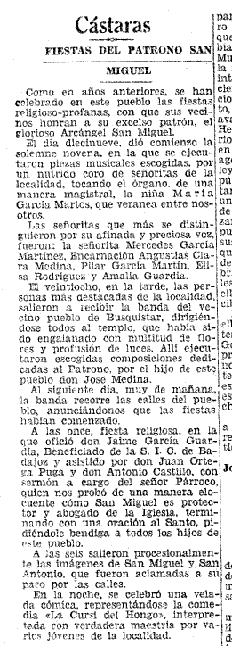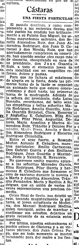 En homenaje a nuestros antepasados, que se esforzaron por dotar su existencia con esa pincelada festiva y cultural, y en agradecimiento a estos castareños, nativos y de adopción, que han trabajado para recuperar la costumbre, hemos traído aquí algunas fotografías y unos recortes de IDEAL sobre las fiestas de 1933, que citan la comedia representada aquel año y su elenco.