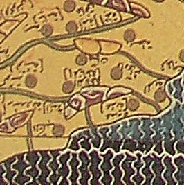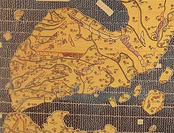 Dos detalles de una copia, conservada en la Bodleian Library de la Universidad de Oxford, del mapamundi trazado en el siglo XII por el ceutí al-Idrisi. En el primero se aprecia la península Ibérica, norte de África y parte del Mediterráneo, incluyendo las Baleares, Córcega y Cerdeña. En el segundo, una ampliación de la zona sur donde se distinguen Sierra Nevada, la Alpujarra y, muy pequeñito, lo que parece ser el río Guadalfeo. Para adaptarlo al convencionalismo actual, se han invertido las imágenes, pues al-Idrisi dibujó el mapa con el sur en la parte de arriba. (Imágenes tomadas del «Atlas nacional de España»).
