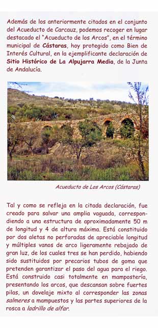 Tras mencionar el intento, logrado en parte, de impermeabilizar la Acequia Real de Cástaras en los años noventa (pag. 57), unas páginas después aparece el primer elemento patrimonial considerado en el libro. Se trata del Acueducto de los Arcos, importante y muy deteriorada obra hidráulica construida en fecha indeterminada en el cortijo al que ha acabado dando nombre, que se encuentra cerca del límite de Lobras por el este y del cortijo Lobrazán por el oeste, en las coordenadas geográficas 36º 55' 20" N 3º 13' 35" O. El capítulo III. El agua en la agricultura, apartado Las estructuras auxiliares de de conducción, contiene unos párrafos y una fotografía, reproducidos en el recuadro siguiente, informando sobre esta importante construcción del municipio castareño, declarada Bien de Interés Cultural hace poco.