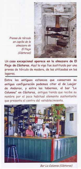 En la página 216, una fotografía y varias líneas sobre el bar La Columna representan a Cástaras en el apartado dedicado a los espacios comerciales y recreativos, dentro del capítulo de servicios. El bar La Columna arraiga en una tienda de comestibles establecida hacia 1890 por mi bisabuelo Gabriel García Ortega, continuada, ampliada y reformada por mi abuelo Enrique, que la atendió hasta mediados los años 1960. Aún conserva casi incólume la apariencia que tenía hace cincuenta, sesenta o más años, cuando se despachaba sal, arroz, azúcar, arencas, tacos de jabón Lagarto y pastillas de Heno de Pravia, tintura de yodo, bismuto, clorato potásico, sosa cáustica, botones de todas clases, carretes de hilo de La Cadena, tintes Iberia, pimiento molido, sellos de correos, papel de barba, chocolate Tárrega, flanín El Niño, cuarterones de tabaco, libritos Jean, Peninsulares, Ideales y caldo gallina, paquetes de Ganador o de Bisonte para los días de fiesta, las primeras cajetillas de Ducados, etcétera, etcétera, etcétera. La estantería de chopo que hizo mi tío Gabriel está prácticamente como se instaló en los primeros años 1940, mientras que el mostrador, que era rectilíneo, ha sido reformado para aumentar el espacio destinado a los clientes en la nueva función que ahora tiene el local. La columna de hierro fundido que da nombre al bar, es en realidad un tubo de los que llevaron al pueblo para conducir el agua desde la alberca de Fausto hasta la turbina de la fábrica de luz inaugurada en 1930. Mi abuelo vio la oportunidad de aumentar el espacio del mostrador y darle anchuras a la tienda, sustituyendo con uno de aquellos tubos las tres cuartas partes de un pilar enorme situado en medio del recinto, cuya base aún debe estar bajo el mostrador. Ingeniosa y original idea de resultado perdurable, que ha llamado la atención de visitantes y curiosos.