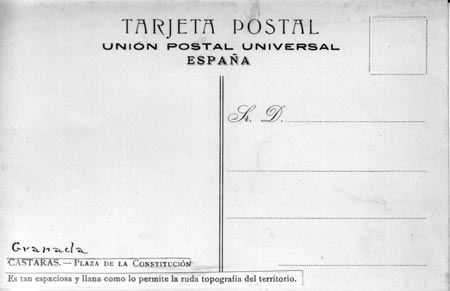 Se trata de dos cartulinas de 13,7 x 8,9 con las fotografías ocupando toda la extensión del anverso y con el reverso como se reproduce. Ambas llevan pegadas en el reverso, como cartelas, los pies de foto que aparecen en las respectivas imágenes del cuaderno 147 de Porfolio fotográfico de España. La de la Plaza lleva escrito a mano antes de los recortes «Granada».